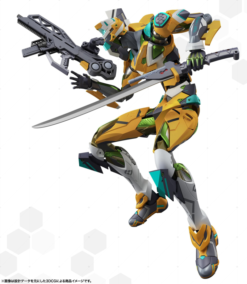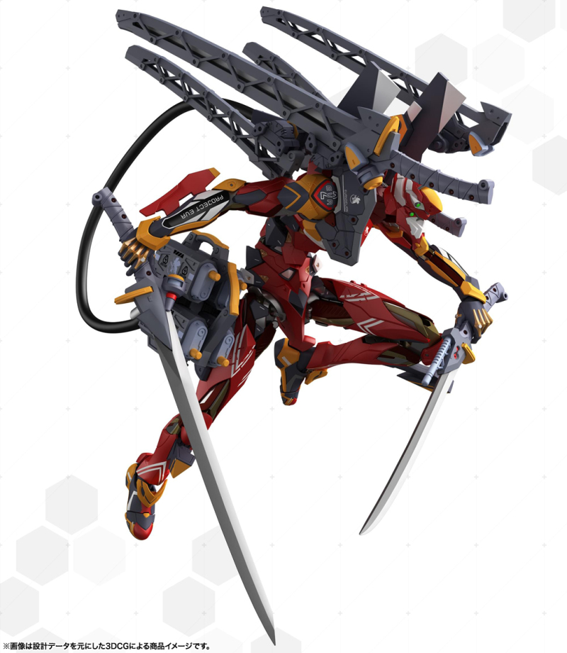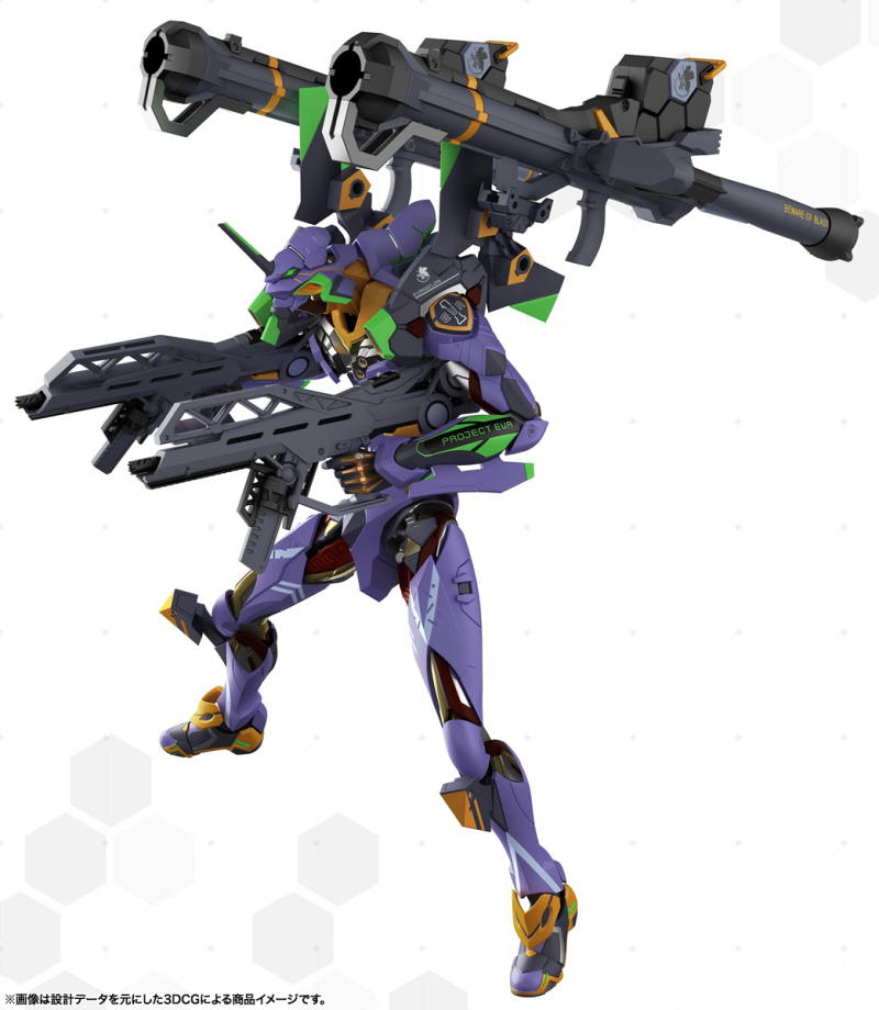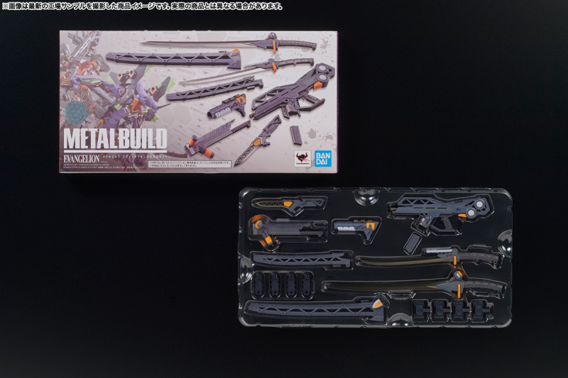 「METAL BUILD EVA專用武裝套組」搭配另售的機體,享受更加豐富變化的武器組合。以外傳小說《新世紀福音戰士 ANIMA》為靈感的武裝-孫六滅絕刀(Magoroku Exterminate Sword)及刀鞘,似槍短刀防禦刀(Counter sword)、刀鞘,以及能使用長槍管、槍刀、榴彈發射器等配件替換三種攻擊模式的步槍,賞玩雙槍、華麗的雙刀流等重裝造型!