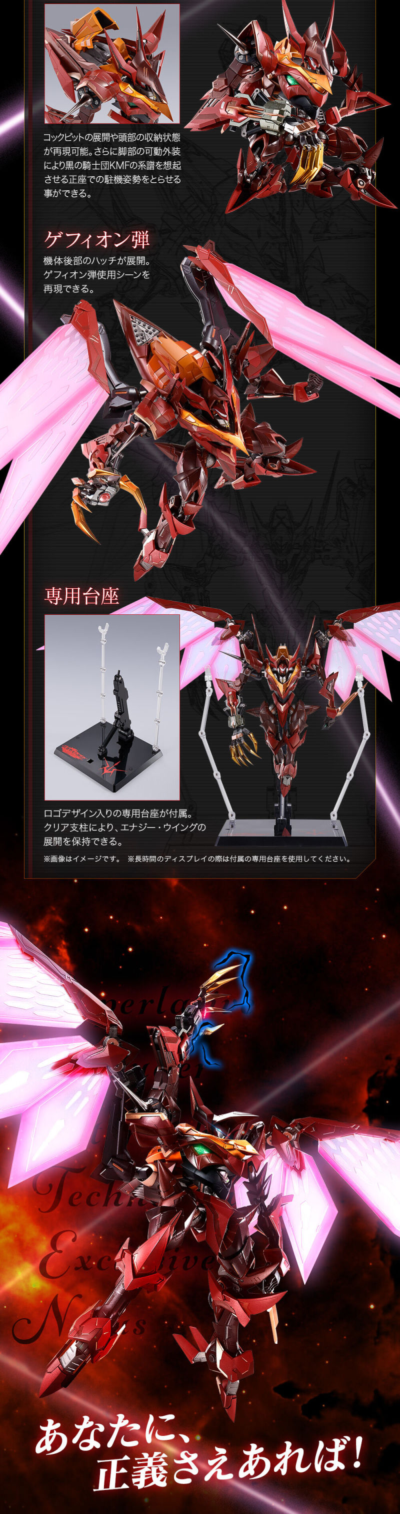 除了合金零件外,全機也採用 ABS、PVC、透明零件等複合材質製作,並施以厚重金屬色塗裝、電鍍上色,在全高 18 公分、最大翼長 75 公分的尺寸下展現極致的色彩。武裝則有 M.V.S.、飛燕爪牙等配件,腳掌高機動驅走輪、背部葛馮彈發射口皆具備展開機構。