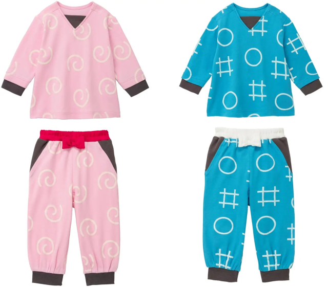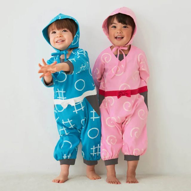 可以看到設計上就是以劇中亂太郎他們穿著的藍色忍者服為造型,粉紅色的則為女性忍者學生穿著的服裝;皆附有可配戴的連帽設計,可以讓小朋友穿上變身成小忍者 XD !