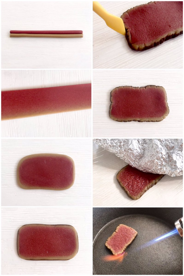 他也分享了製作方法,是用兩種顏色的杏仁糖混色製作而成,透過精細的加工讓其呈現出牛肉該有的色澤及紋理,並透過塑型製造而成。肉質的紋路是用鋁箔紙壓印處理,透過噴槍加熱,讓邊邊有著像是牛肉烤熟的顏色。