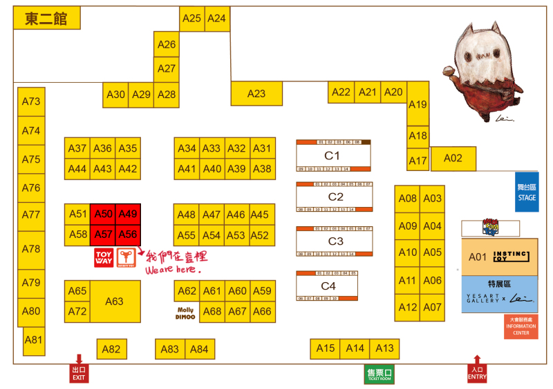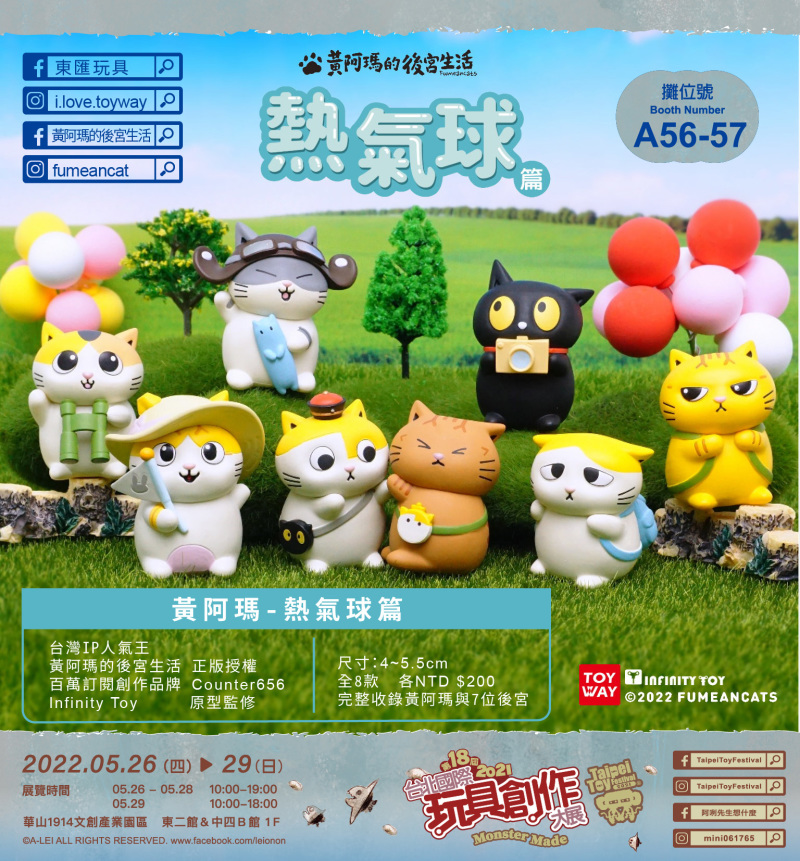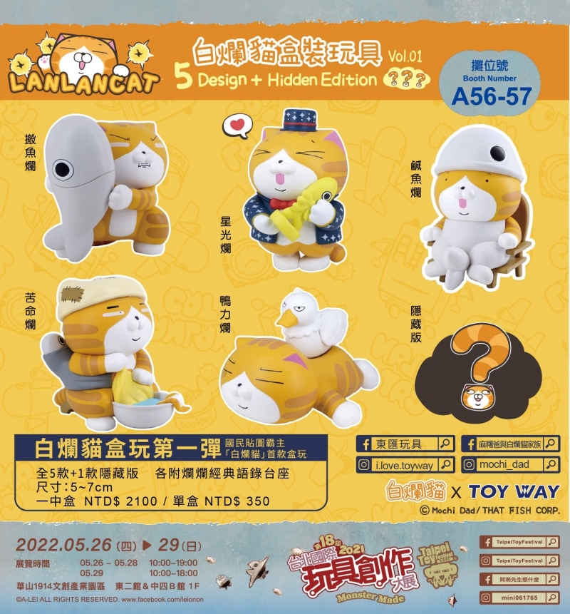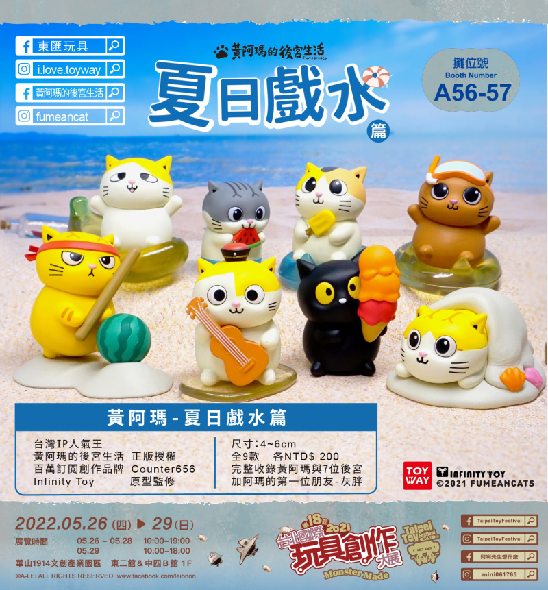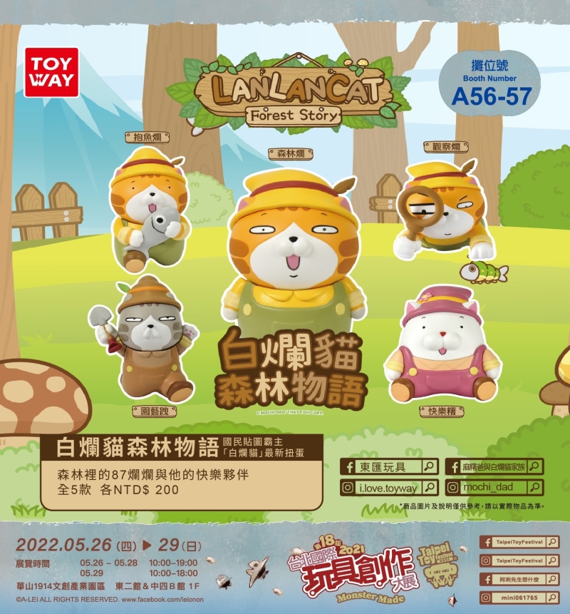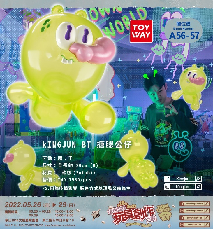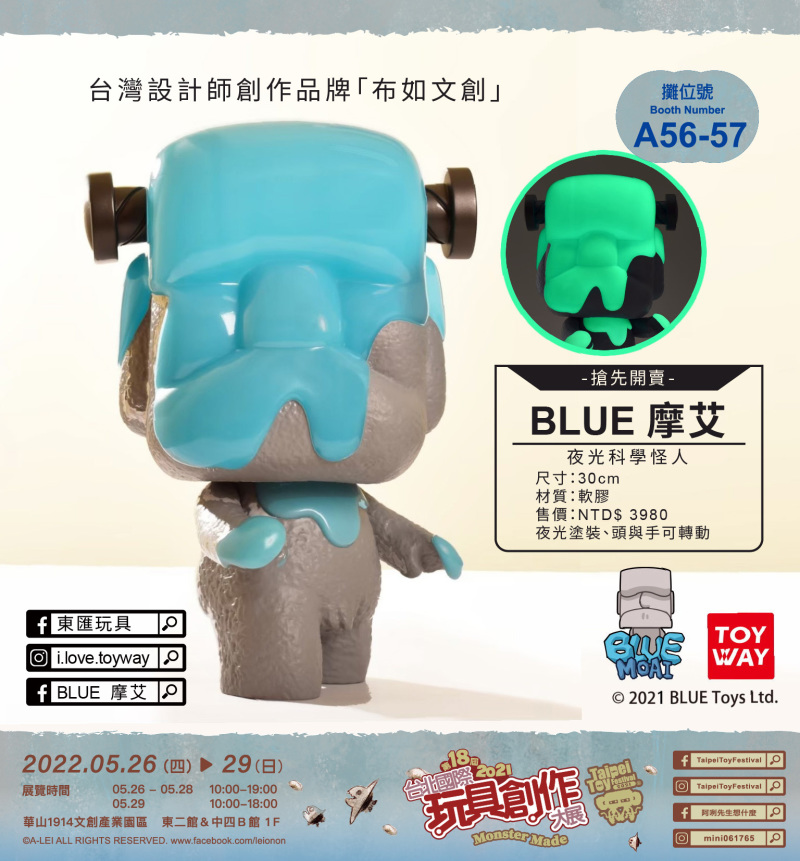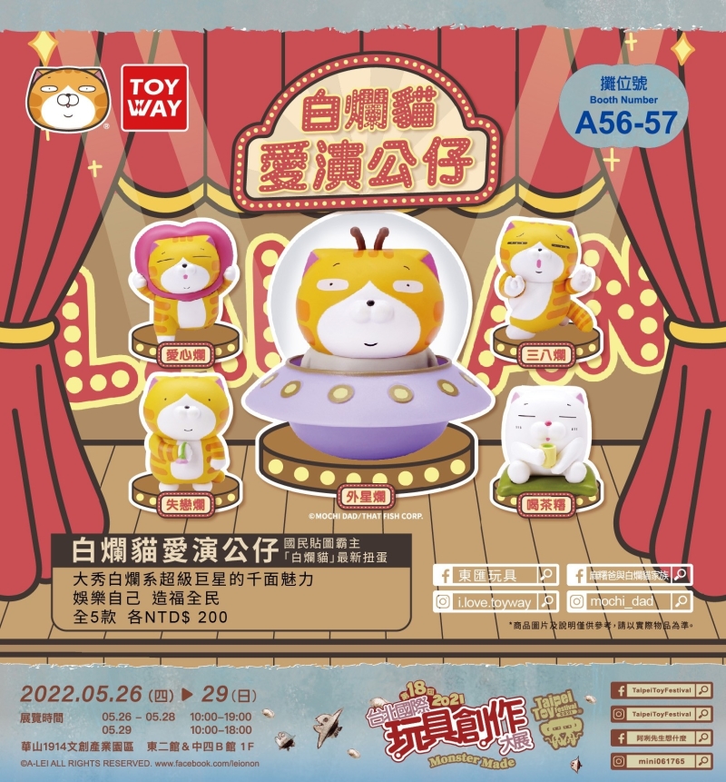 展出陣容包含超人氣圖像創作者「KINGJUN」的首款限量「BT外星人搪膠公仔」 、國民貼圖霸主「白爛貓」、知名IP 「黃阿瑪的後宮生活」、原創設計玩具品牌「牛奶玩具公司」的小福獸2-夏日祭典等周邊商品,以及布如文創的限量超巨大「夜光科學怪人-BLUE摩艾」,現場也將設立扭蛋區,搶先開扭最新的白爛貓扭蛋!