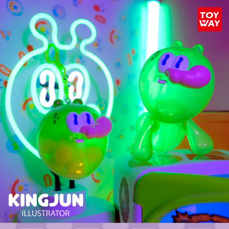 全長約20cm,頭、手可動,選用KINGJUN最經典的代表色-螢光綠,並以透明軟膠呈現,螢光透綠的BT就像飄浮在太空中的泡泡糖,更擁有亂亂畫星球最可愛迷人的翹屁屁。