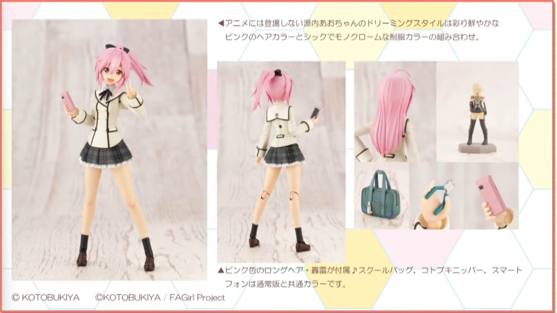 此次商品情報一出馬上就讓人感受到親女兒等級的待遇,「源内蒼【若葉女子高校・冬服】」套件一共採用 16 種成形色零件組成,並且上衣、裙子、表情等零件都已經塗裝完成,組裝後馬上就能大幅再現劇中形象。而表情零件更是一口氣附上 5 種塗裝完成表情 + 5 種未塗裝表情,共 10 種零件來呈現劇中豐富可愛的表情變化,是系列發售至今最多的套件。