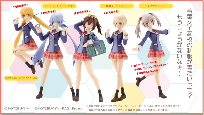 由日本模型商壽屋(KOTOBUKIYA)與插畫家森倉圓合作推出的日常系美少女組裝模型『創彩少女庭園』系列,發表了與自家另一系列人氣商品《Frame Arms Girl 骨裝機娘》合作的最新商品「源内蒼【若葉女子高校・冬服】」預計於 2022 年 12 月發售的消息。此外僅在壽屋官方通路販售的特殊色限定版「夢幻異色 幸福黑白」有預計在 2023 年 01 月發售。