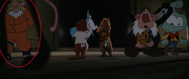 ▼在畫面中,奇奇與蒂蒂兩人解救了被「山谷幫」改造、綁架的動畫明星,其中「漩渦鳴人」也被改造成了一個長著金黃色鬍子、臉頰凹陷的小老頭(?)