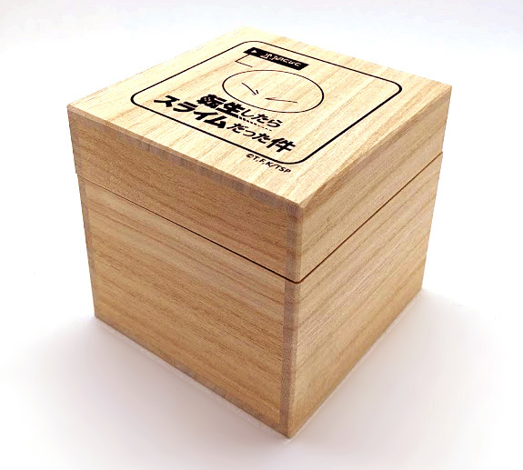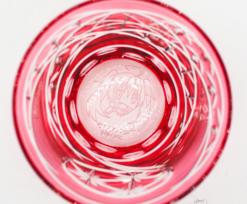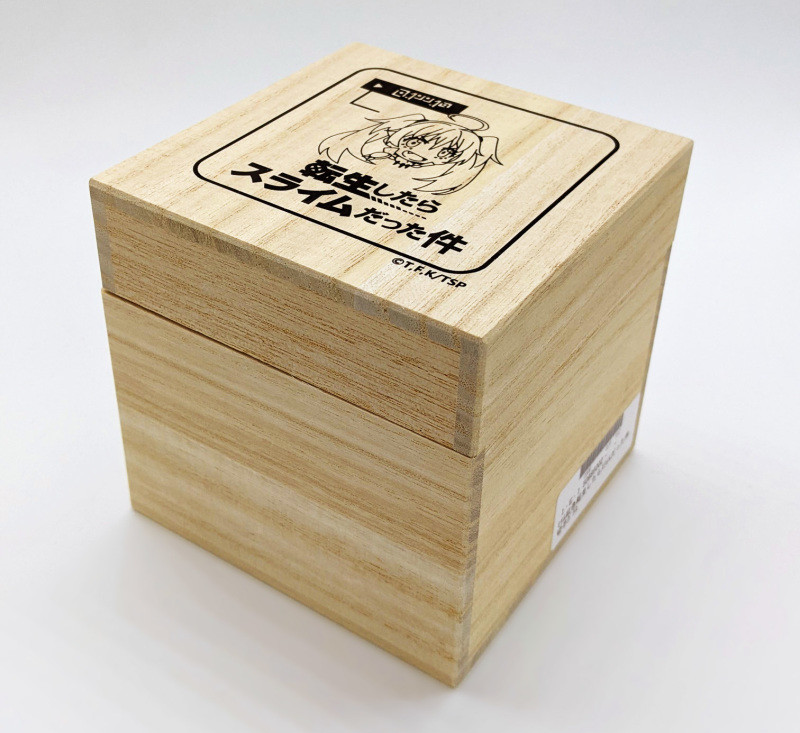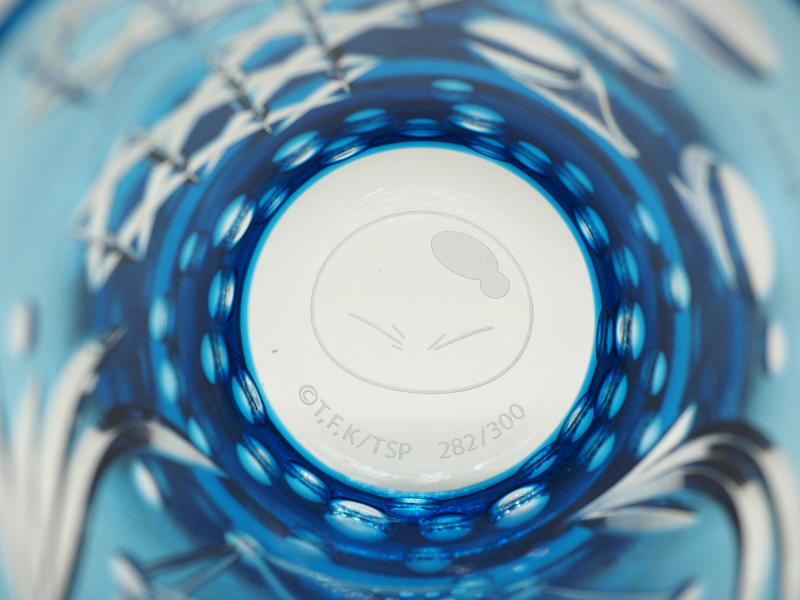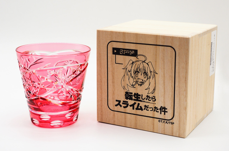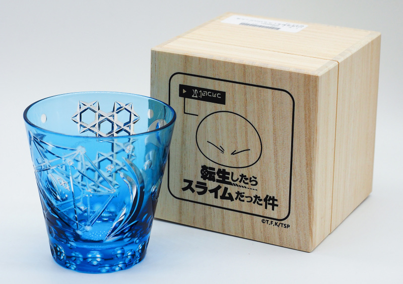 玻璃杯的外盒為特製桐木盒,木質的觸感大幅增加收藏品的價值感,畢竟充滿古物色彩的玻璃藝術品,就必須從外盒就開始講究,外盒精緻的印上利姆路可愛的臉,跟名酒般的收納外盒有種對撞的衝突美感,展現跨時空聯名也同時彰顯出東京工藝品「江戶切子」的高貴身分。