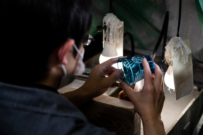 江戶切子可是國家傳統工藝的東京工藝品,源於1834年,江戶⼤傳⾺町玻璃店鋪中,以顏色清澈、花紋精緻的水晶玻璃器聞名。由專業工匠在雙層玻璃表面進行純手工雕刻,切割出細膩且富光澤感器皿的精湛日本傳統工藝。精細的圖紋全靠職人的多年技藝,在切割時細膩調整角度、施力輕重,呈現出職人獨有的藝術美感。