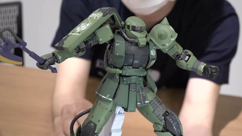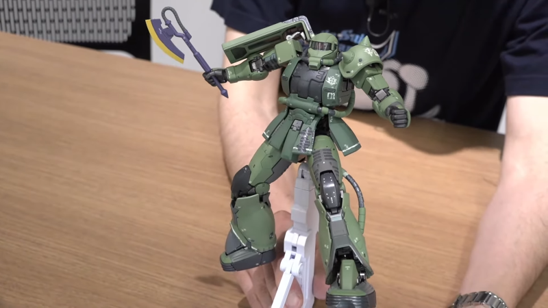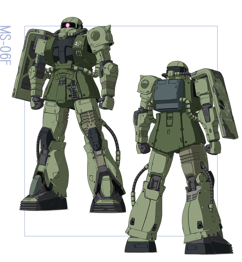德安專用薩克則比較讓人期待會有多數新規製作部分,此次機設融合過去 40 年前《機動戰士鋼彈》TV 版的作畫崩壞,將獨特的馬臉薩克造型合理化成年久失修的狀態,全身更有多處裝甲剝落的戰損設計,相當有特色。
