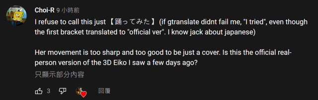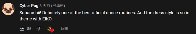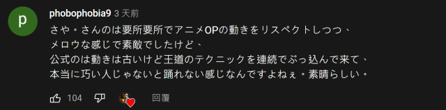 網友也對於さや跳舞的表現十分激賞,以下擷取部分網友回應。可以看到網友對於她舞蹈的技巧以及節奏感都抓得非常穩,甚至比起官方的舞蹈 MV 來說,更具有專業水準