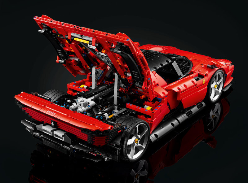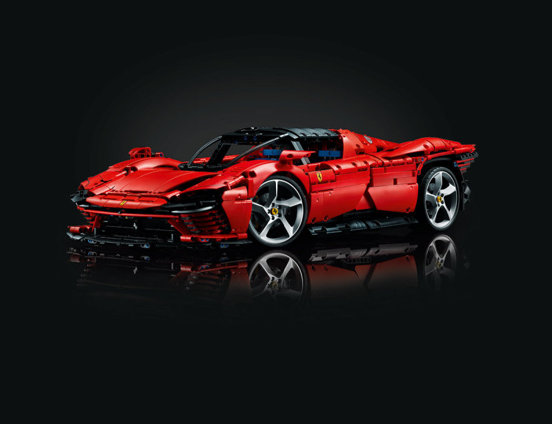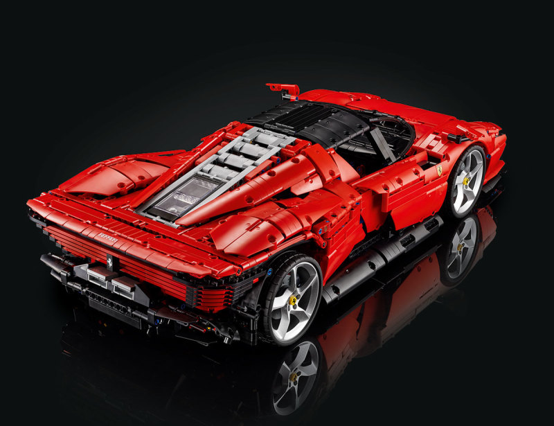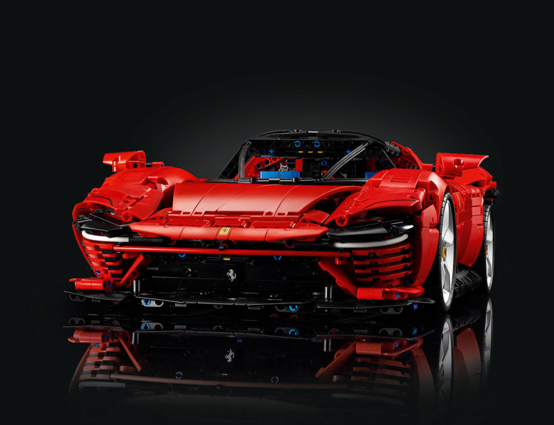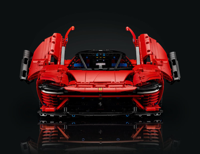 本作一共有 3778 片零件,採用 1/8 的比例充分再現頂級超跑「法拉利 Daytona SP3」,組裝完成之後長度來到驚人的 59 公分,除了極低的底盤、考究還原的輪圈、黃底黑馬的小圓點印刷磚,以及浮誇的車頭、車屁股之外,可自由開啟的蝶翼式車門更是帥到炸裂!可玩性部分包含方向盤帶動的前輪轉向、按鈕驅動的蝶翼式車門開啟、極具存在感的 V12 引擎(搭載可移動活塞)、設置換檔撥片的變速箱、懸吊......等,最大限度地讓各位玩具人感受到科技零件連動性的樂趣。