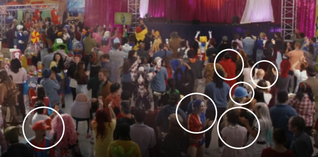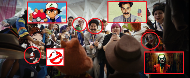 ★ 同一幕還可以看到其他瘋狂的客串 Coser,包括畫面左下角的「超級瑪莉」、畫面右方有「奇異博士」和《玩命關頭》「唐老大」標誌性的光頭和白T、「小丑女」哈莉奎茵在和「莉亞公主」聊天,還有一位戴著《怪獸電力公司》中的工作帽!
