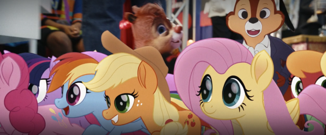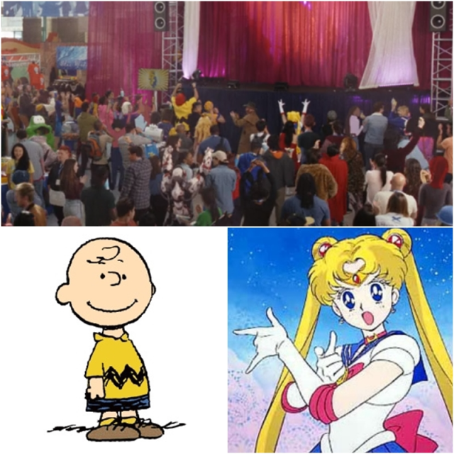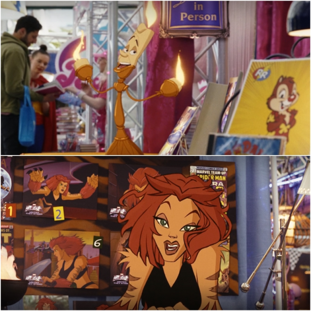 時間來到現代,蒂蒂已經成功升級為CGI明星,並且在動漫展上有自己的攤位。舞台下方的觀眾群當然有大量的客串,其中這個角度,可以看到兩位卡通角色COSPLAY成《花生漫畫》的查理布朗及《美少女戰士》的月野兔。