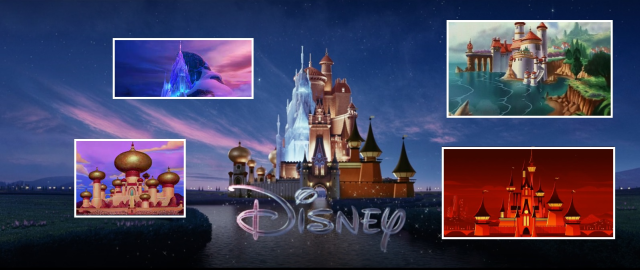 電影片頭的迪士尼城堡被雷射射成不同風格,其中包括《冰雪奇緣》艾莎城堡、《阿拉丁》的宮殿、《小美人魚》艾瑞克王子的城堡和《超人特攻隊2》片頭風格的迪士尼城堡。