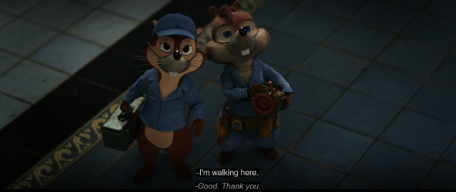 奇奇和蒂蒂扮成水管工人,潛入澡堂要埋伏甜彼得,恰巧撞見了Bob,並且說了一句:「我在走路。」(I’m walking here)這裡的台詞和語氣致敬了1969年由達斯汀·霍夫曼與強·沃特所主演的經典同志電影《午夜牛郎》的台詞。
