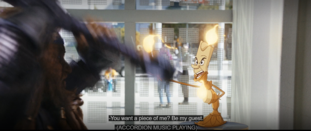 ★ 燭台盧米埃和虎女及時阻止,盧米埃還說了一句:「Be My Guest」惡搞他在《美女與野獸》中的經典歌曲《Be Our Guest》。