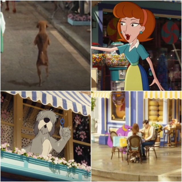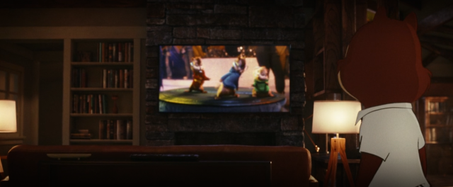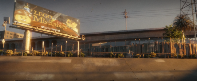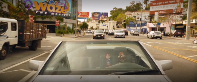 前往主大街的路上,有一個《位智玩電影》(Waze the Movie)的電影看板。「位智」是一款GPS導航系統,在2013年被Google收購。這裡當然也諷刺了如今各種手機軟體也能有自己的電影。另外畫面右邊也有《阿德日記》中阿德和寵物狗「豬排」(Porkchop)開設的律師事務所看板。