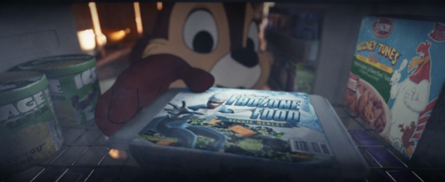 奇奇從冷凍庫裡拿出一盒《超人特攻隊》的「酷冰俠冷凍蔬菜」,一旁還有《冰原歷險記》鼠奎特冰淇淋和《樂一通》來亨雞冷凍雞肉。