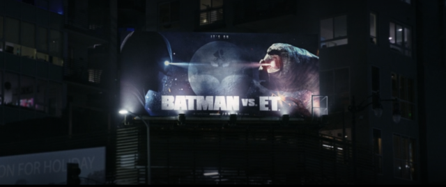 《蝙蝠俠對E.T.》的電影看板,惡搞了《蝙蝠俠對超人》這部電影。
