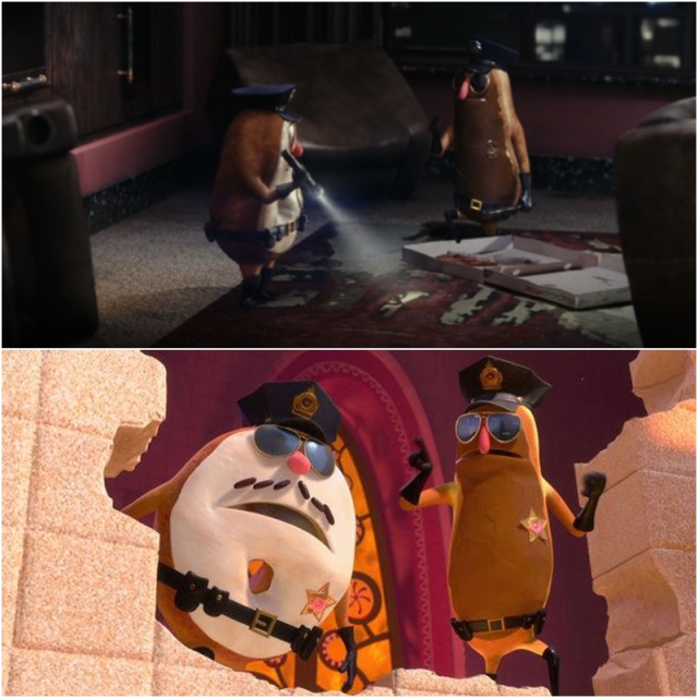 當蒙弟被綁架後,警方來到他的住處勘查。其中有兩個是《無敵破獲王》裡的甜甜圈警察!