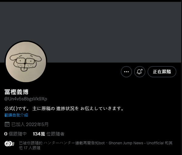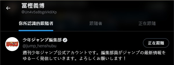 ▼《週刊少年Jump》編輯部官方也Follow了「冨樫義博」Twitter