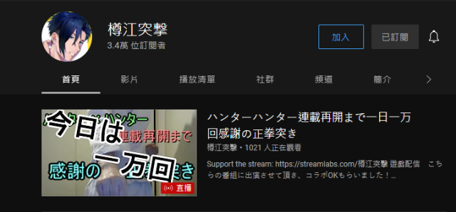在昨晚我們與各位聊過這位超級鐵粉後,在今(25)日上午,YouTuber「樽江突撃」似乎也特別為了祝賀《HUNTER×HUNTER》「冨樫義博」從Twitter上的復出,也特別從往日的「一日一千次正拳」,加碼到「一日一萬次」的驚人數量。而且到目前為止(截至下午5點40分)已經直播了將近8個小時的時間。