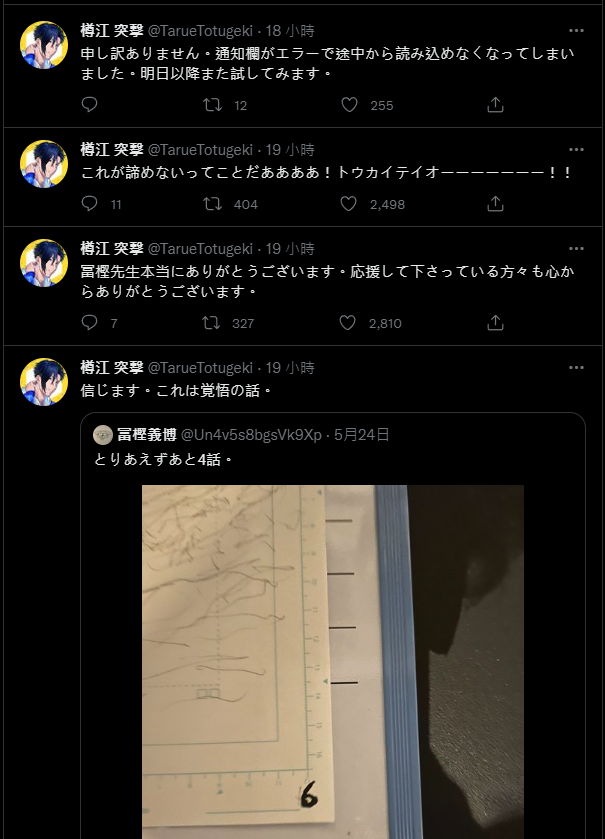 ▼得知冨樫老師回歸的「樽江突撃(@TarueTotugeki)」,也在Twitter上表達他的喜悅