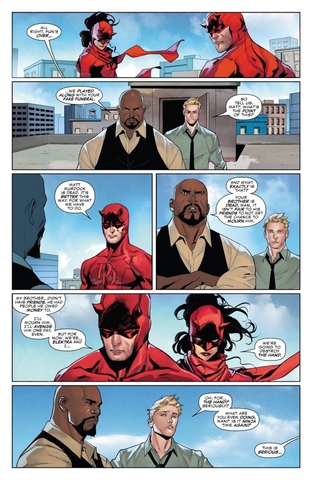 就在此時,知道大人物們都在喪禮上的匪徒們搶劫了銀行,待在屋頂上的四人及時趕到並打倒了搶匪,但是此時原本以為應該已經被解除的反義警組織「雷霆特工隊」再次登場,原本試圖要逮捕兩位夜魔俠,但看在市長本人的面子上決定撤退,也讓盧克發現原來這項法案其實還沒結束。