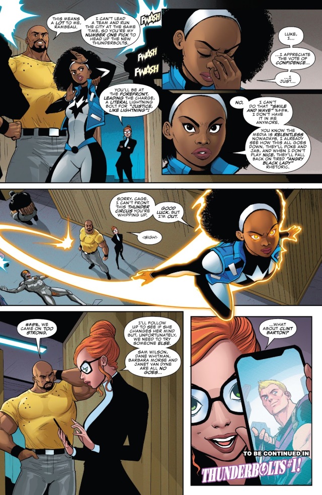 稍晚,盧克與「光譜」前去突襲一間雷霆特工隊的基地,打倒了包括十字骨(Crossbones)在內的所有人。原來盧克想藉由指派光譜作為新隊長的方式,不是廢除雷霆特攻隊,而是改組成一支紐約市官方的超級英雄執法團隊。莫妮卡並不喜歡這個點子,而公關認為下一順位最適合的人選則是...鷹眼!