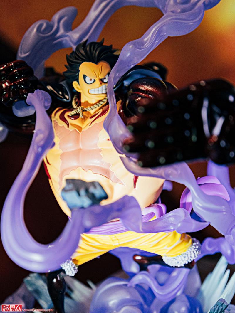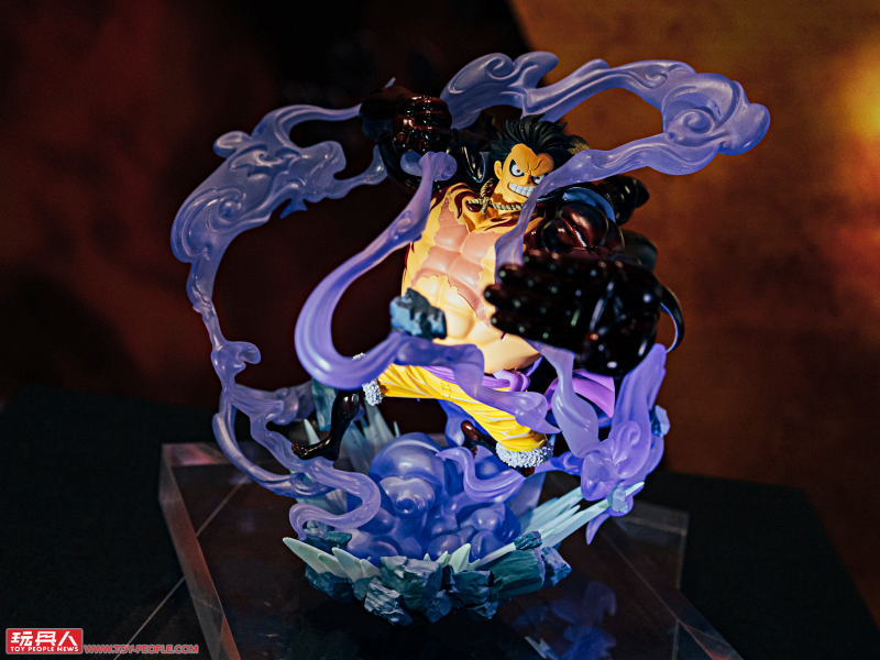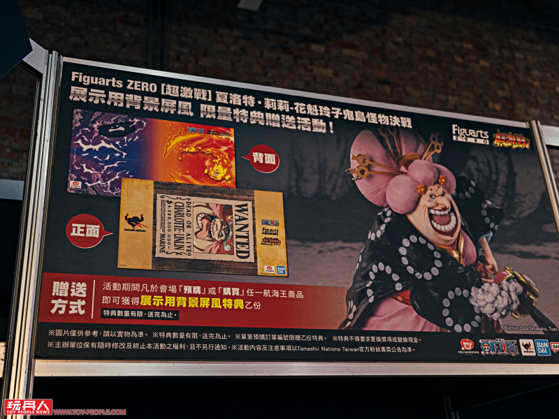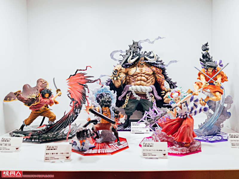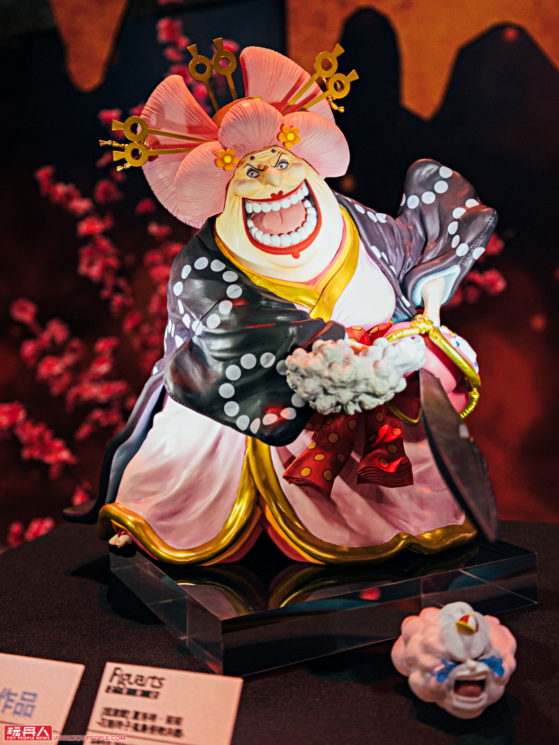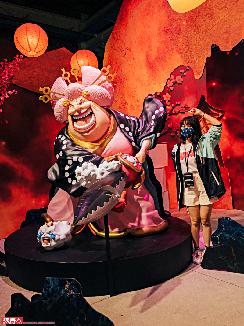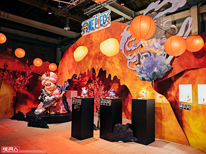 一進門就是人氣作品《ONE PIECE》的主題展區,這裡有 Figuarts Zero 系列的「夏洛特·莉莉 花魁玲子 鬼島怪物決戰」與「蒙其·D·魯夫 四檔 三船長 鬼島怪物決戰」新作展示,根據 Figuarts Zero 夏洛特·莉莉模型資料直接放大打造的立像相當驚人,鬼島場景更是擁有強烈臨場感!