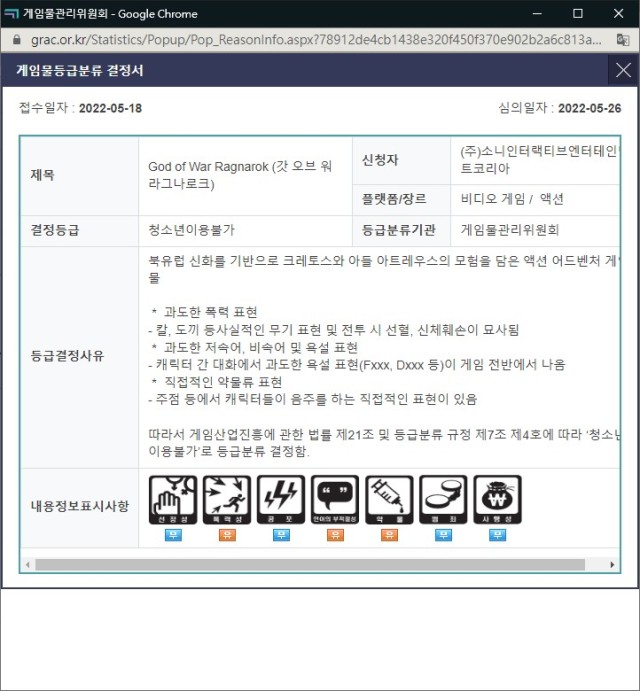 根據韓國電玩評測網站給予《戰神:諸神黃昏》評級的內容,因該作含有刀具、斧頭等武器殘殺的血腥暴力畫面,以及角色對話中也出現大量的粗俗台詞與髒話(Fxxx、Dxxx…等字眼),還有角色喝酒、吞食藥物等,因此也將本次作品評列為「禁止青少年遊玩」的18禁分類。