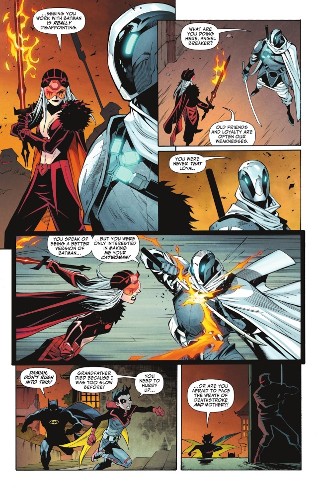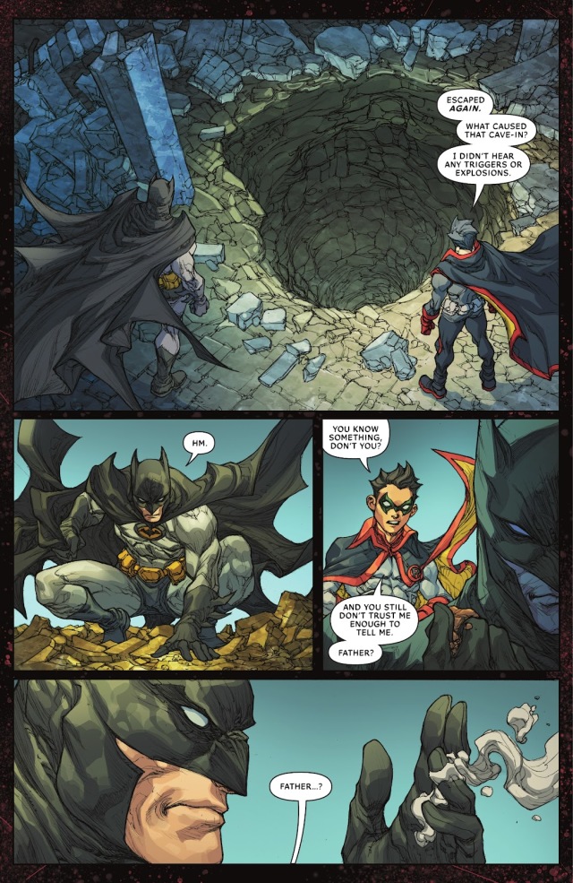 另一方面,蝙蝠俠和羅賓追尋著喪鐘舊制服的線索來到了專門為超級反派處理裝備的商店,卻發現老闆已經奄奄一息;但是穿著喪鐘制服的不明人物仍然在此,向蝙蝠俠表達自己只想處理掉惡魔一家和喪鐘一家後,就以不明方式挖出了超長地洞逃跑。蝙蝠俠顯然因此發現了什麼,但是不願意透露。
