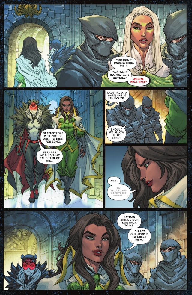而在塔莉亞這邊,收到天使破壞者(Angel Breaker)傳達的現況後,她向自己的祖母、拉斯的母親「靈魂母親」(Mother Soul)表達了拉斯已死的事實,並決定把她丟回拉薩路島(Lazarus Island)監禁;但是靈魂母親卻留下了有關哪吒再臨的警告,也為之後的《蝙蝠俠大戰羅賓》留下預告。