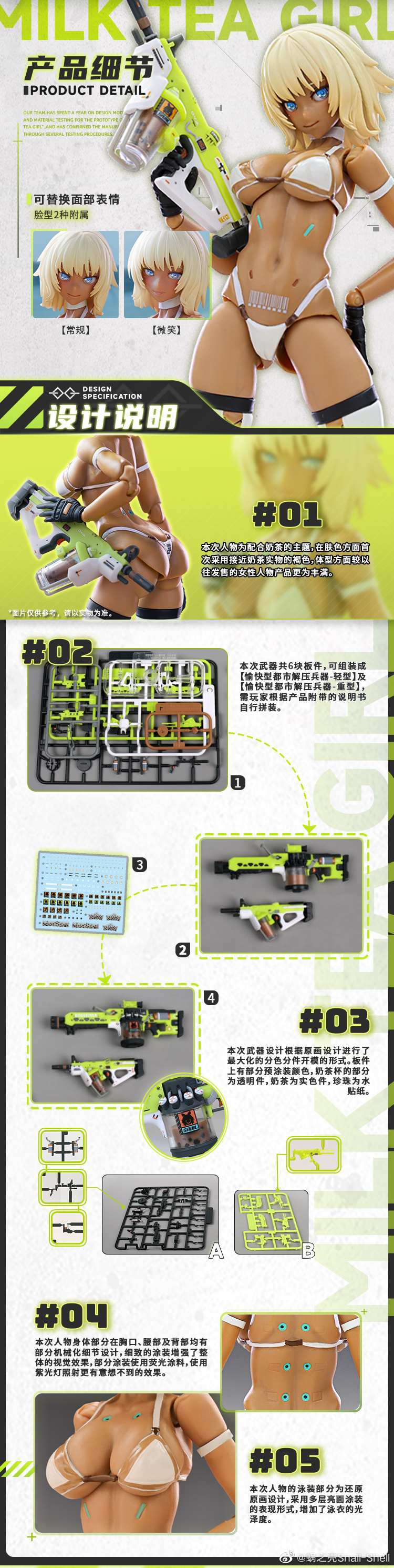 由繪師犬司機(@犬司机)的擔任原畫設計,結合奶茶主題,素體首次採用了褐色黑肉膚色,體態也相較先前的素體設計更為豐滿迷人,從裡到外飄出奶茶香~在胸口、腰及背部都有機械感的機體細節,並部分施以螢光塗裝,在紫燈下增添科幻效果!