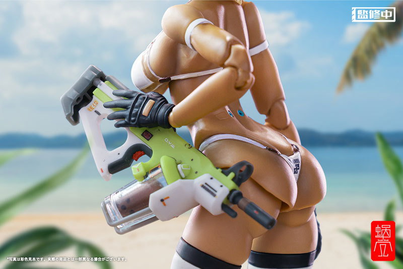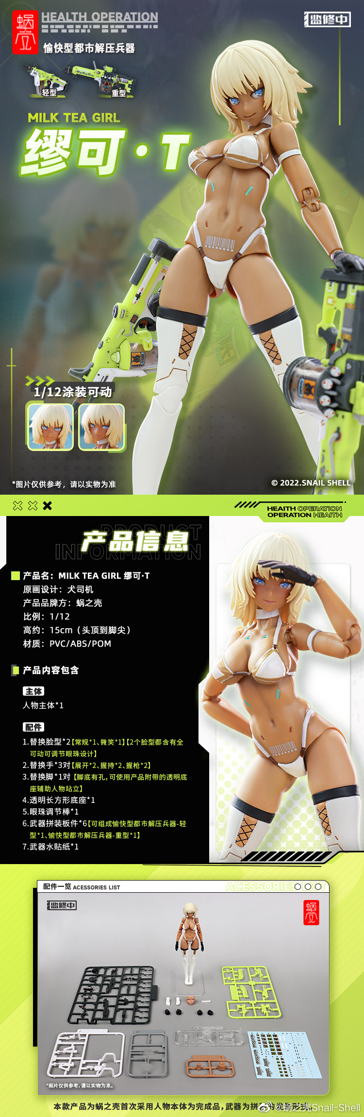 蝸之殼工作室原創機娘「MILK TEA GIRL 謬可·T」1/12 比例可動完成品,尺寸約高 15 公分,打造出迷人奶茶肌膚與金黃短髮搭配的超性感火辣辣機娘~並附有豐富的配件,包含有淺淺一笑的普通臉、吐舌微笑兩款替換表情,搭配碧藍的可動眼球設計與手勢,生動搭配各種情境!另外,需自行組裝的武器,可組裝成愉快型都市解壓兵器輕型/重型,還原原畫的複雜分色,更有預塗裝、透明珍珠零件等,重現可愛繽紛的奶茶槍!