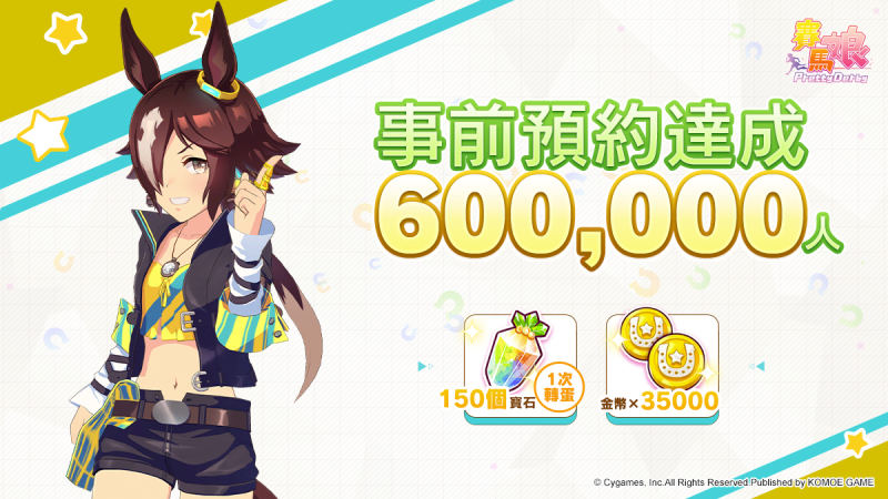 《賽馬娘Pretty Derby》繁體中文版遊戲事前預約正在火爆進行中,玩家可前往App Store、Google Play與官網參加預約活動。目前已成功達成60萬人次預約目標,將額外贈送「起跑衝刺★3交換券×1」,訓練員們可在遊戲上線後,從清單中兌換喜歡的指定★3培育賽馬娘!