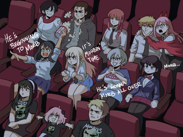 這些角色不僅是喊著「It’s Morbin Time!」「He’s Beginning To Morbin」等梗台詞,可以看到就連近期火紅的《SPY×FAMILY間諜家家酒》(SPY×FAMILY)「佛傑一家」也穿著電影《魔比斯》的紀念T,不過看來安妮亞倒是很開心的樣子,不像後面被灑到爆米花的《進擊的巨人》(進撃の巨人)艾連那樣…這顯然是要在電影院內變成巨人了是吧XD
