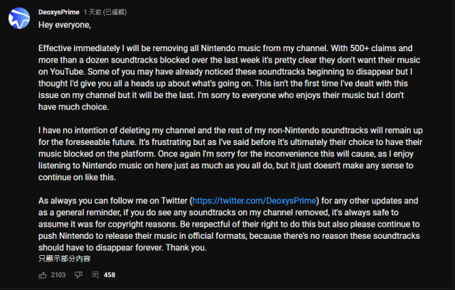 事實上,這也不是DeoxysPrime頭一次面臨這樣的問題,據悉在2019年時他也曾經收到任天堂法務部的版權聲明,要求他將含有《斯普拉遁2》(スプラトゥーン2,又譯《漆彈大作戰2》)、《異度神劍》(ゼノブレイド)、《魔兵驚天錄2》(ベヨネッタ2)等遊戲音樂全部刪除,而一直到現今才將這些含有任天堂版權音樂的影片配樂全數移除。