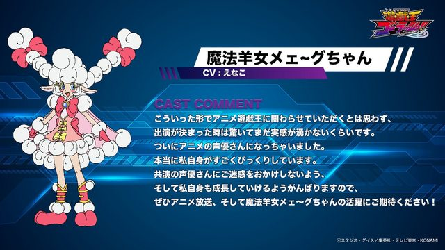 《遊戲王GO RUSH》是《遊戲王》系列的第八部動畫作品,而魔法羊女咩咕醬 ( 魔法羊女メェ~グちゃん ) 是其中主角群的一張王牌卡片,當初動畫釋出消息時就揭露由えなこ配音演出,雖說えなこ的聲優經驗其實並不多,不過這樣可愛的角色給她擔綱,好像也不意外 XD。
