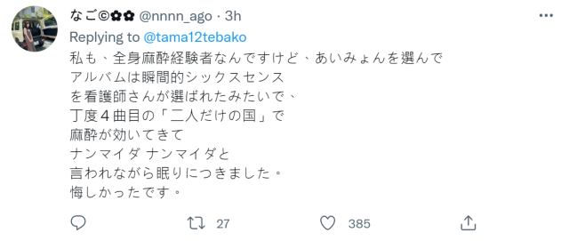 ▼ 有網友選擇聽 Aimyon(愛繆、あいみょん) ,放到第四首「二人だけの国」 就安穩入眠到手術完成了