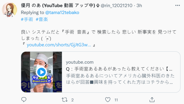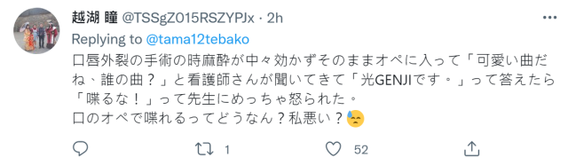 推主表示,自己在麻醉手術時聆聽米津玄師的歌曲「M八七」,也表示出院後要跟孩子一起去看電影《新·超人力霸王》,結果因為溝通錯誤,放成了「Lemon」,結果讓整個手術房呈現一個哀傷的氣氛,還好手術還是順利成功了 !