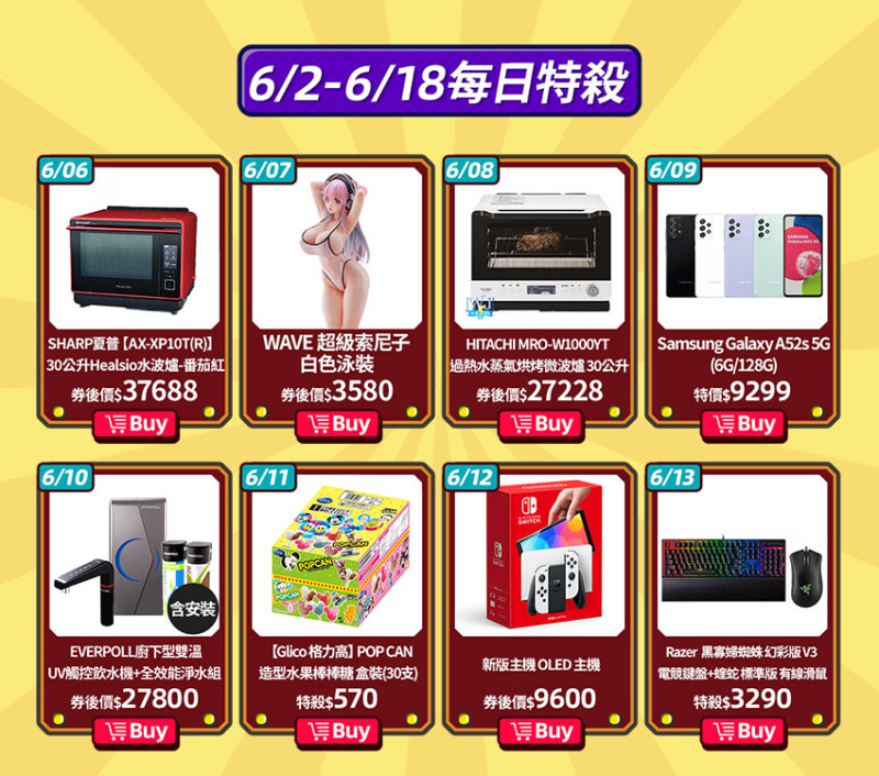 活動內容:6/2 - 6/17 每天推出一個驚喜下殺價商品,特價商品包含Samsung Galaxy A52s只要$9299,新版Switch OLED主機$9600,記得先搶券再購買最划算!