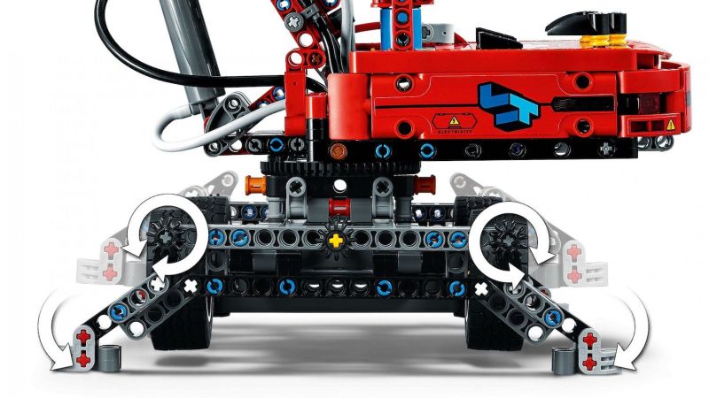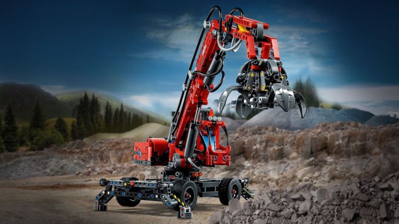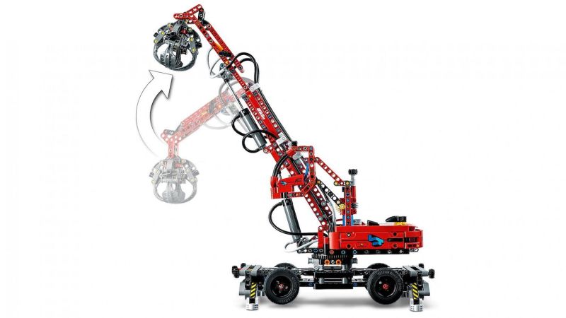 本作一共 835 片零件,組裝完成之後可以得到搭載豐富機關的四輪材料裝卸機,整體以紅、黑、灰色為主調,並設有一個藍色的單人座位,吊臂可以調整出多種角度、作業爪臂也能自由開闔,藉由多個手動、氣動的功能,讓你體驗此類工程機具的實際運作方式,而在底部還可以將固定器翻轉出來,增加作業時的穩定度!感覺就很好玩啊~而這款模型所配有的大量管線也讓整體造型更加豐富,推薦給喜歡把玩樂高零件連動的機械迷。