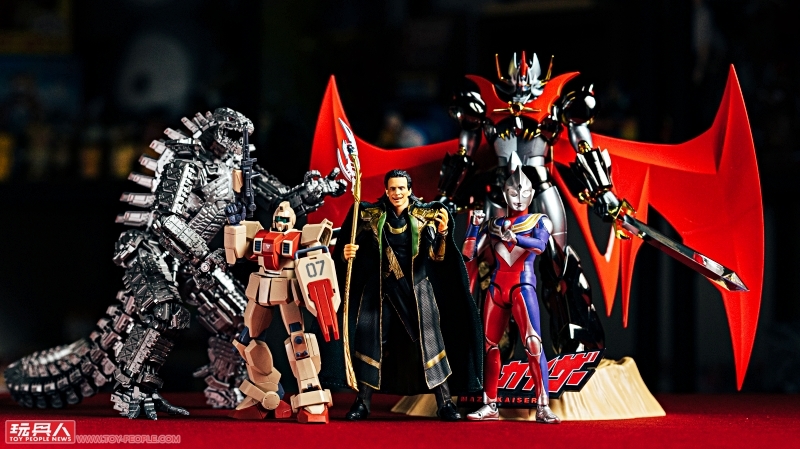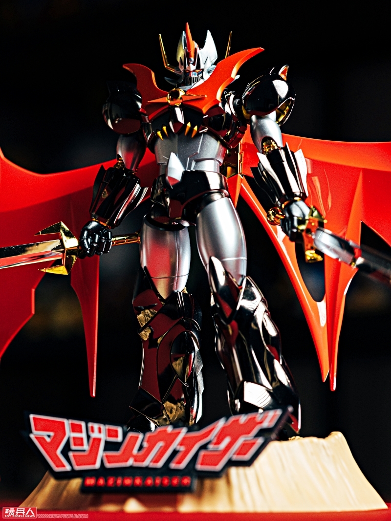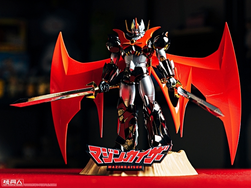 最後要來玩的,就是廣受機器人迷喜愛的合金可動玩具系列-超合金魂,這次以電鍍塗裝再登場、全身閃耀著金屬光輝的「魔神凱薩 20周年紀念版」真的是超級華麗又帥氣的作品!銳利的線條、艷紅的飛翼、同樣施以電鍍的寶劍,把玩起來真是痛快絕頂!