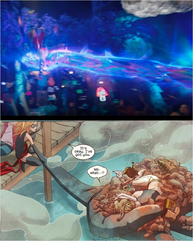 卡瑪拉能力爆發後造成意外,第一個拯救的是被掛在巨型雷神槌上的佐伊。而在漫畫中驚奇少女第一個拯救的對象就是意外溺水的佐伊,一樣是使用了巨型手臂來拯救她。
