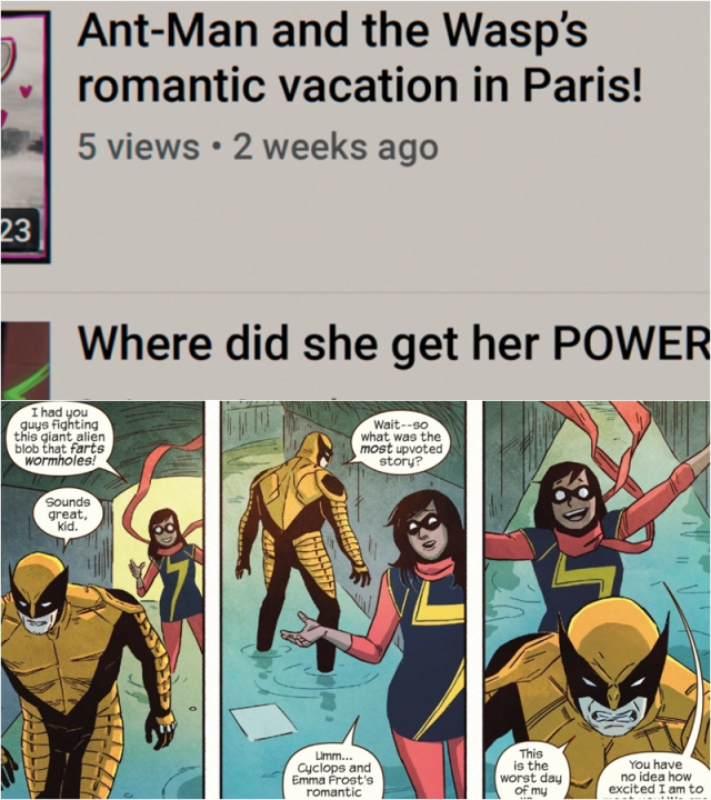 卡瑪拉有個同人創作是《Ant-Man and the Wasp's Romantic Vacation in Paris!》這是致敬2014年漫畫中,卡瑪拉在「發明家」的基地遇到金鋼狼時,和他分享自己寫過的同人小說《獨眼龍與白皇后的巴黎浪漫假期》(Cyclops and Emma Frost Romantic Vacation in Paris)。
