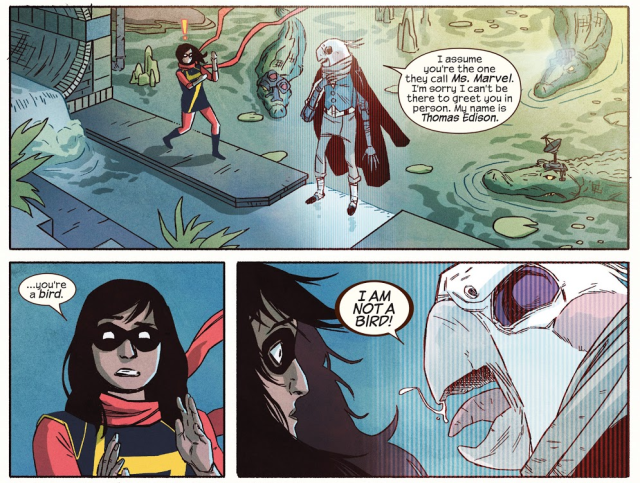 另外,那個鳥的造型可能是仿自《驚奇少女》漫畫中的反派「發明家」湯瑪斯愛迪生(你沒聽錯),他是被一個名為 Gregory Knox 的科學家用愛迪生的 DNA 創造出來的克隆體。 但在陰錯陽差之下,被複製到自己的寵物鸚鵡身上。