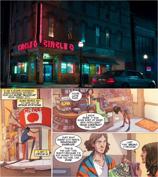 卡瑪拉和父母吵架後,到圈Q便利店頂樓找布魯諾散心。 背景可以看到一個「愛迪生電力」的招牌,這致敬了前面提過的《驚奇少女》漫畫反派「發明家」愛迪生。