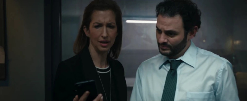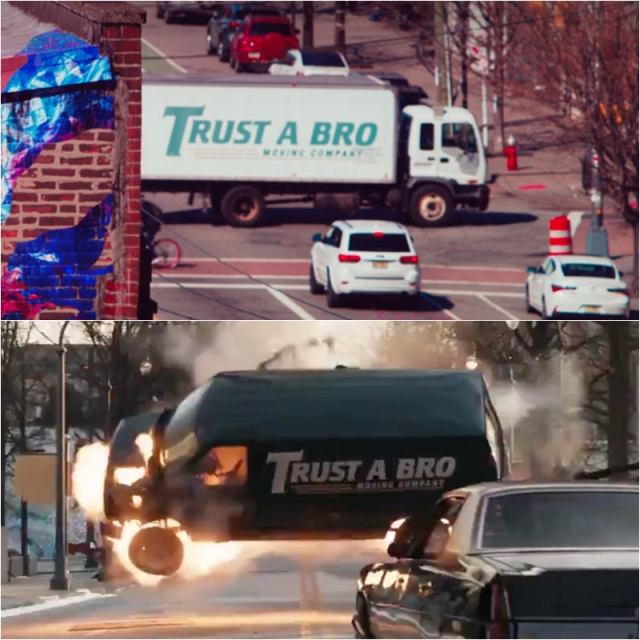 另一個字卡則可以看到《鷹眼》影集運動服黑幫的 Trust a Bro 貨車在後面。