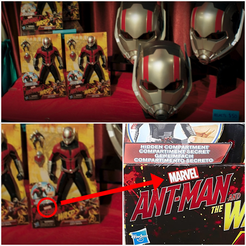 博覽會現場有販售現實中孩之寶所發行的《蟻人與黃蜂女》電影周邊玩具,而且還保留著漫威的標誌,難道漫威宇宙裡也有「漫威」存在?
