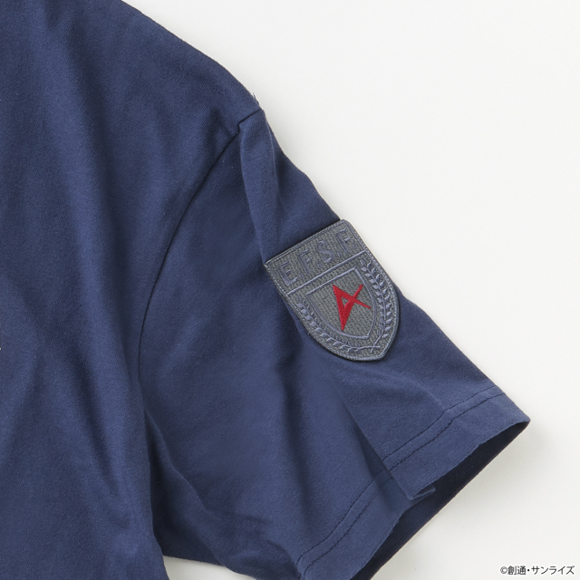 以美式風格的文字呈現地球聯邦的字樣,還附帶劇中部隊朗德·貝爾 ( Londo Bell ) 的名稱,並附上「宇宙世紀」的數字,搭配左手臂的聯邦軍徽布章,簡單好搭配。